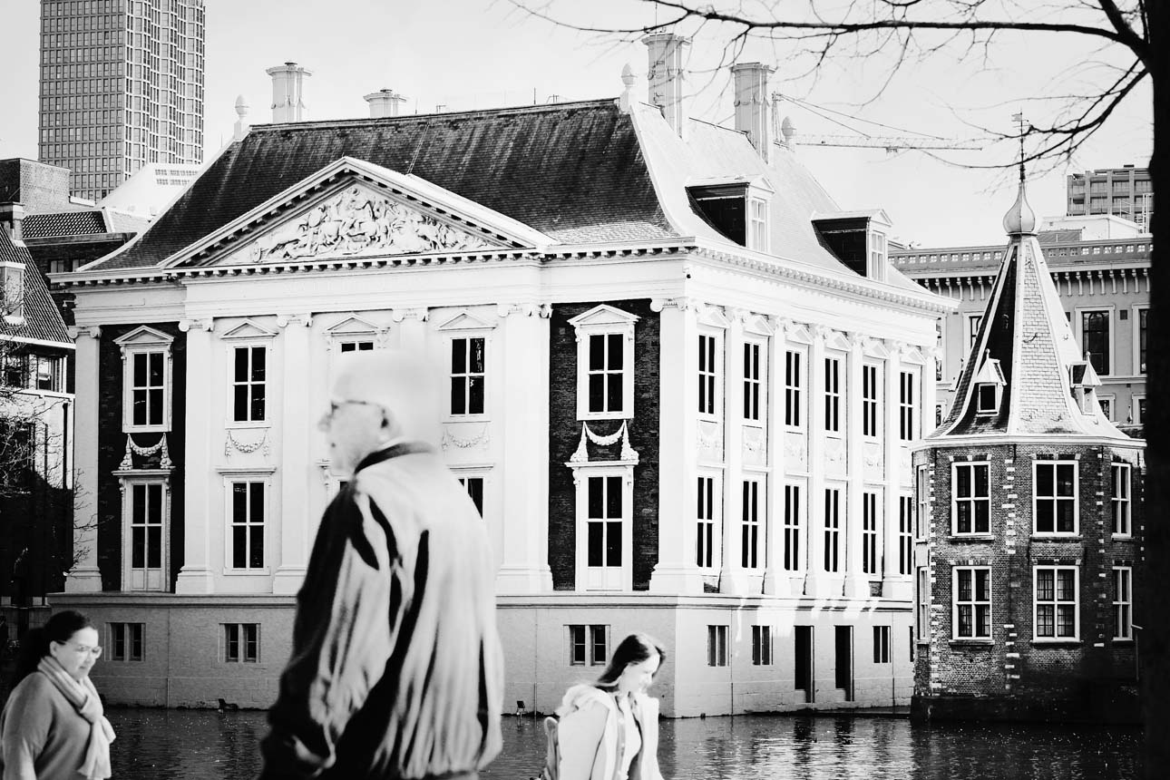 Als je Den Haag kent, weet je dat het Mauritshuis aan het water ligt. Maar, door het water weg te laten, krijgt de foto een andere uitstraling. Fotografie is ook de kunst van het weglaten.