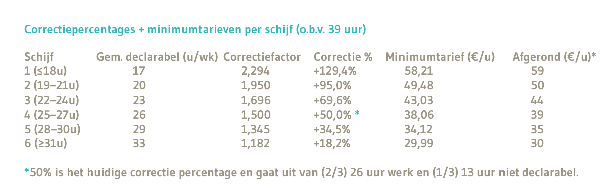 Het is niet nodig om voor elk beroep een apart minimumtarief vast te leggen. Veel beroepen hebben vergelijkbare declarabele uren. Daarom kan een schijvenmodel uitkomst bieden.