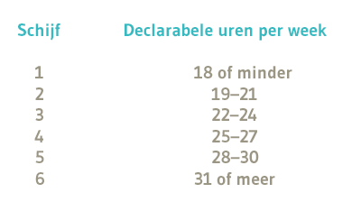Uitgaande van 44 werkbare weken per jaar kan de realiteit van declarabele uren per week verdelen in bijvoorbeeld zes duidelijke schijven:
