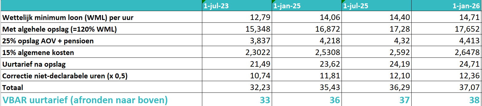 De huidige benadering in de VBAR en de zelfstandigenwet gaat nu nog uit van één minimumuurtarief, vanaf 1-1-2026 is dat 38 euro.Dat lijkt helder, maar doet geen recht aan de realiteit. Het maakt namelijk enorm verschil of je 30 uur per week declarabel bent, of structureel niet verder komt dan 17, 21 of 25 uur per week.